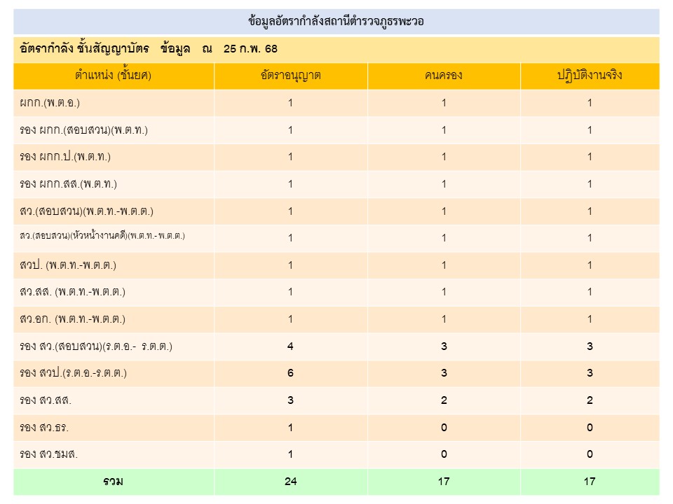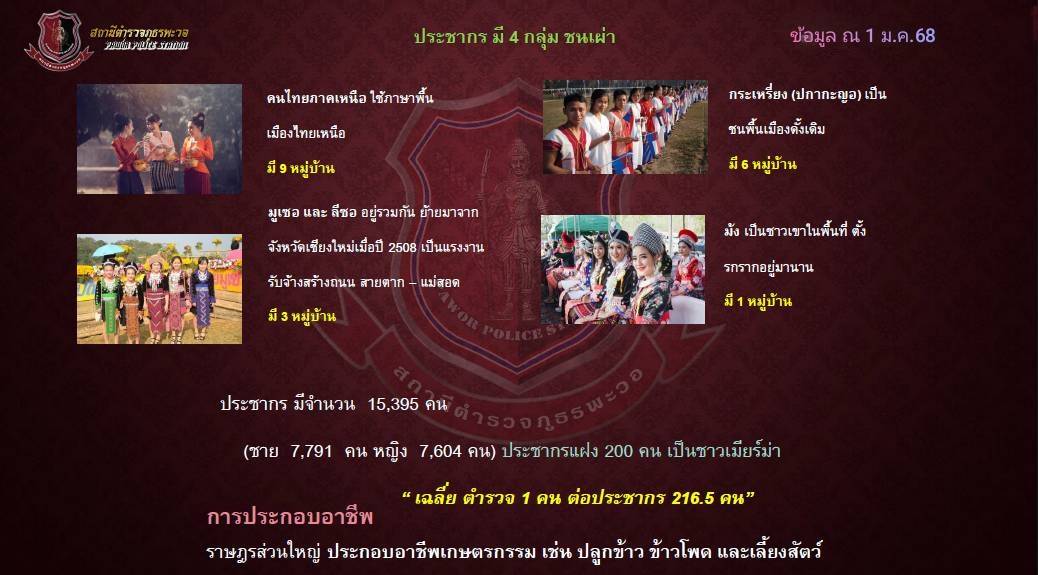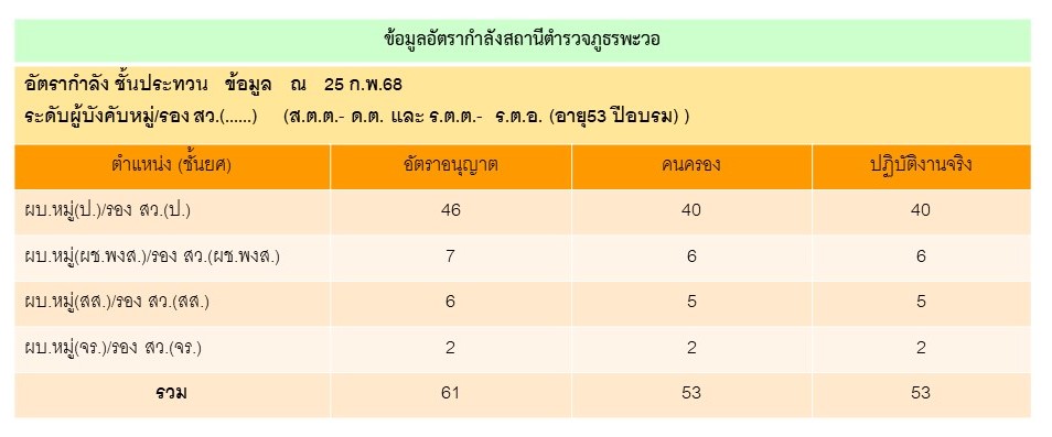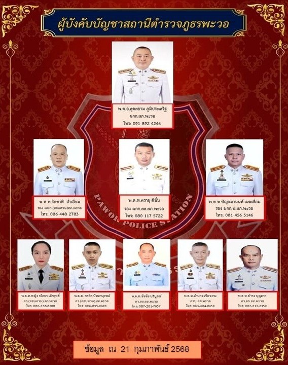 O2 ข้อมูลผู้บริหาร อัตรากำลัง และพื้นที่รับผิดชอบ ผู้บริหารสถานีตำรวจภูธรพะวอ อัตรากำลัง พื้นที่รับผิดชอบ ( 798.91 ตารางกิโลเมตร ) ข้อมูลประชากรในพื้นที่ (ข้อมูล วันที่ 1 มกราคม 2568)
